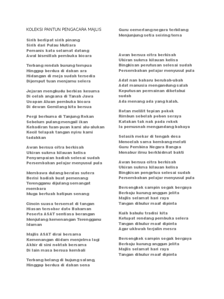 Ucapan Guru Besar Sempena Hari Raya Kabar Blok. KOLEKSI PANTUN PENGACARA MAJLIS KOLEKSI PANTUN PENGACARA MAJLIS Sirih berlipat sirih pinang Sirih dari Pulau Mutiara Pemanis kata selamat datang Awal bismillah pembuka bicara Terbang rendah burung tempua Hinggap berdua di dahan ara Hidangan di meja sudah tersedia Dijemput tuan menjamu selera. Sehubungan dengan itu koleksi pantun yang saya kongsikan ini merangkumi lapan 8 jenis pantun yang dapat saya kongsikan iaitu seperti berikut.
